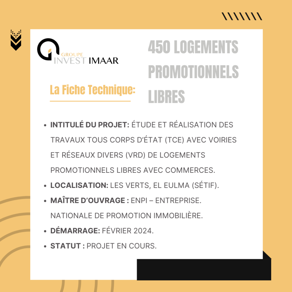 Nous poursuivons, au sein du Groupe Invest Imaar, la réalisation d’un important projet immobilier à vocation résidentielle et commerciale dans la wilaya de Sétif, à travers notre filiale SPA ETRBHM Boubata Rabah. Ce projet s’inscrit pleinement dans la dynamique de développement urbain de la commune d’El Eulma et répond à une demande croissante en logements promotionnels de qualité.