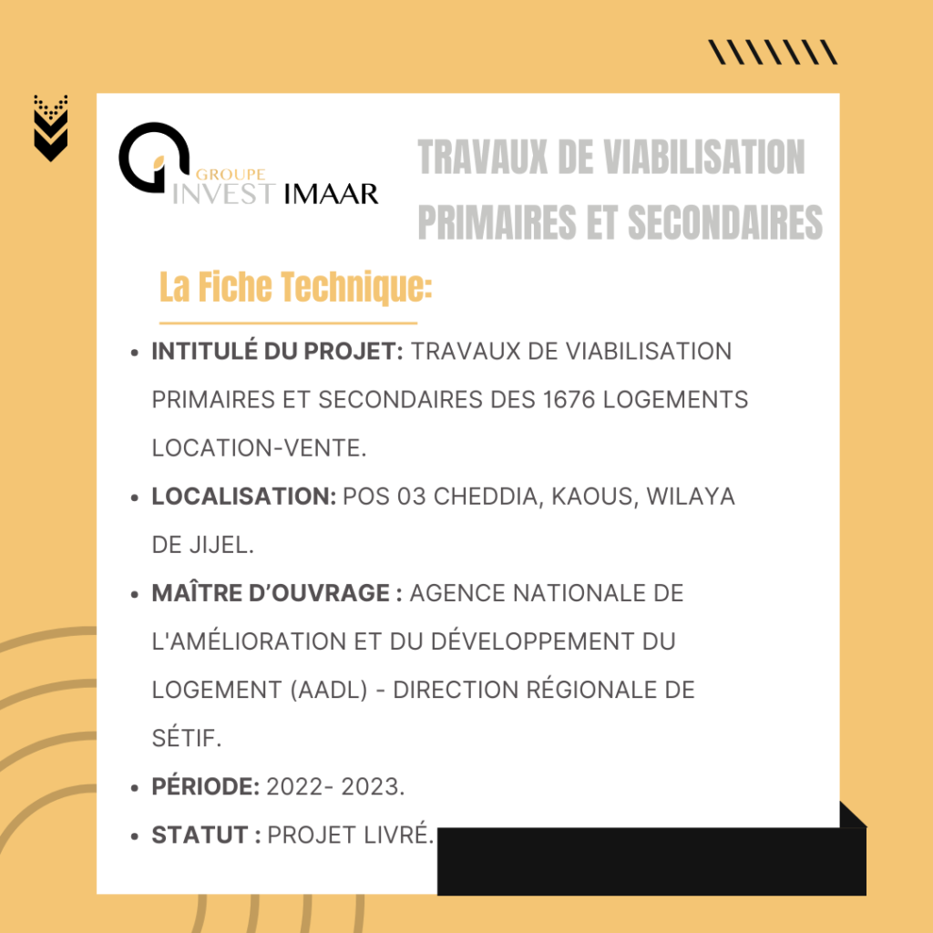 Au sein de la SPA ETRBHM Boubata Rabah, filiale construction du Groupe Invest IMAAR, nous sommes honorés de contribuer activement au développement des infrastructures résidentielles en Algérie. Notre entreprise a été mandatée par l’Agence Nationale de l’Amélioration et du Développement du Logement (AADL) – Direction Régionale de Sétif, pour la réalisation intégrale des travaux de viabilisation primaires et secondaires.